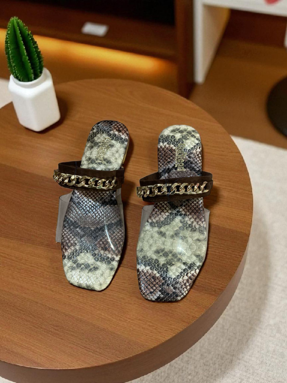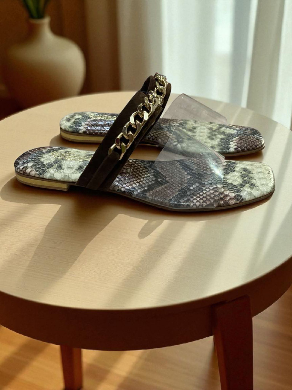 The Medusa is a masterpiece of juxtaposition. The upper features a sleek, transparent sheet strap that creates a contemporary "floating" effect, perfectly framing the foot. At its heart, a bold snake print pattern in rich browns and blacks is layered beneath, adding a touch of untamed glamour. The pièce de résistance is a gleaming golden chain that elegantly drapes across the upper, injecting a shot of opulent, hardware-driven detail.
